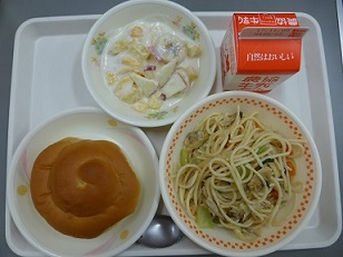 ミルクロール、和風スパゲティー、ヨーグルト和え、牛乳