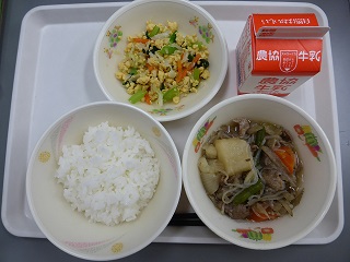 ごはん、肉じゃが、ホロホロ和え、牛乳