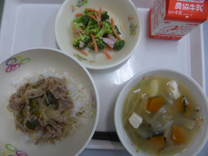 *中学年の量です。 今回 豚丼を献立にしましたが、甘みのある味付けが肌寒い一日とあい、しっかり食べてくれました。ブロッコリーのごま和えは1学期にすりごまベースにしましたが、今回はマヨネーズを足しました。味噌汁は