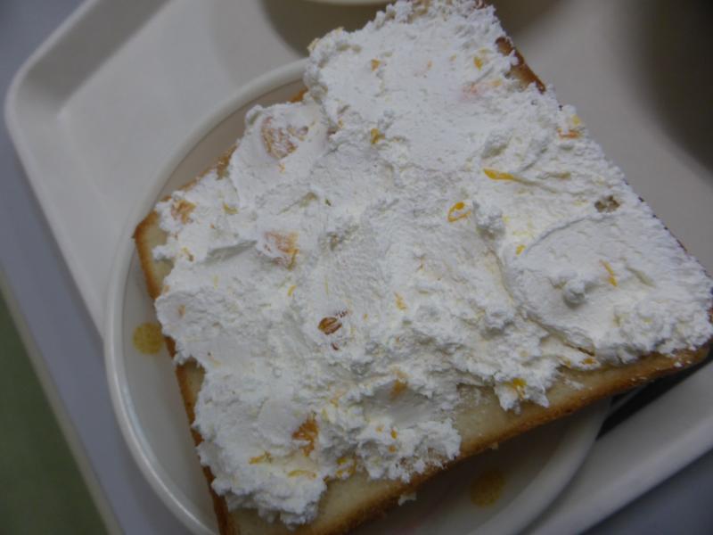 季節の果物をはさむと季節感もでて楽しめると思います。河井共同調理場では配送も2方向あるため、配送時間の都合上、フルーツ缶詰とホイップクリーム、ヨーグルトで作りました。