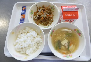ごはん、五月汁、五目きんぴら、ふりかけ、牛乳