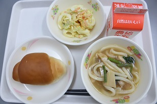 バターロール、山菜うどん、たまごサラダ、牛乳