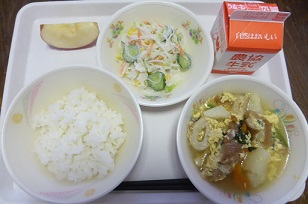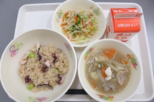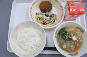 ごはん、ミンチカツ、五目なます、とり汁、牛乳