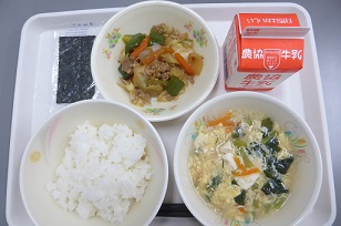 ごはん、回鍋肉、サンラータン、韓国海苔、牛乳