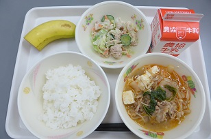 ごはん、豚キムチ鍋、ツナサラダ、バナナ、牛乳