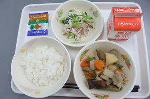 ごはん、いりどり、切干し大根サラダ、ふりかけ、牛乳