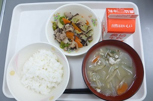 ぼはん、豚肉の生姜煮、みそけんちん汁、牛乳