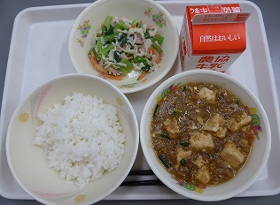 ごはん、麻婆豆腐、切干し大根のサラダ、牛乳
