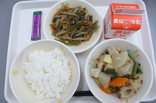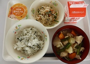 わかめごはん、いりどり、五目なます、みかんゼリー、牛乳