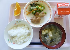 ごはん、とりのから揚、あっさり漬け、みそ汁、オレンジ、牛乳