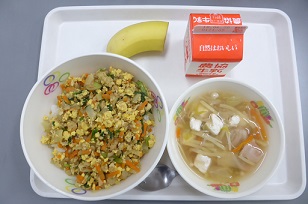 カレーそぼろごはん、千切りスープ、フルーツ、牛乳