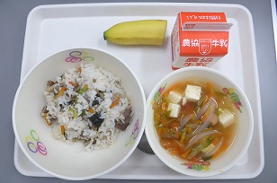 ごはん、なすの肉みそ和え、豚汁、ふりかけ、牛乳