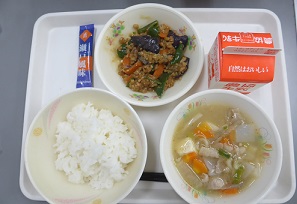 児童の嫌いな野菜のなすとピーマンを肉みそで和えました。中華風の味付けです。なすの紫色成分、ナスニンはガンを予防すると言われています。