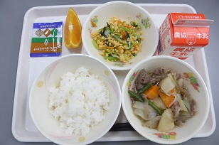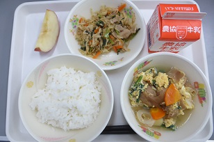 ごはん、たまごとじ、切干し大根のピリカラ炒め、りんご、牛乳