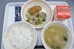 ごはん、とりのから揚げ、野ふきのきんぴら、みそ汁、牛乳