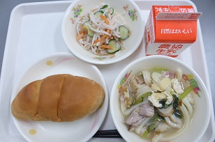 チーズパン、うどんスープ、かみかみサラダ、牛乳
