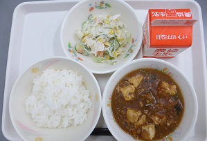 夏野菜カレー、コーンサラダ、月見ゼリー、牛乳