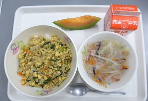 そぼろごはん、春雨スープ、メロン、牛乳