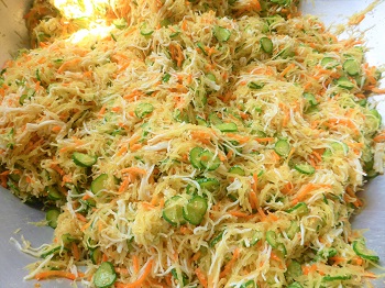 オリビエサラダはロシアの代表的なサラダで、じゃがいも、人参、キュウリ、コーン、たまご、ハムを入れました