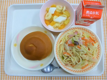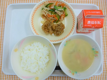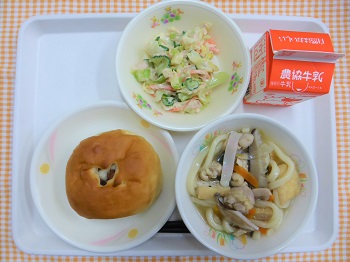 今日の給食は、みかん、かぼちゃ(なんきん)、だいこん、にんじん、こんにゃく、こんぶ、いんげん、などの「ん」が付く食材を、たくさん使用しました