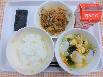 韓国のりでごはんを巻いて、その上にチャプチェをのせて食べる1年生も!!