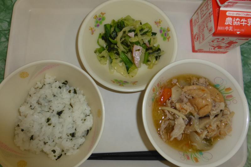 全国給食週間で資料を探していた中に福井県栄養士会のレシピをアレンジして、厚揚げをおなじ大豆製品のミニがんもどきにしてみました。野菜がレシピには人参しかなかったので冬野菜と筍をたしました。とても味が染み込んでいて、厚揚げより1口サイズなので低学年の児童でも食べやすいかと考えました。野菜と豚肉とがんもどきの配分をもう一度考えてみようと思います。
