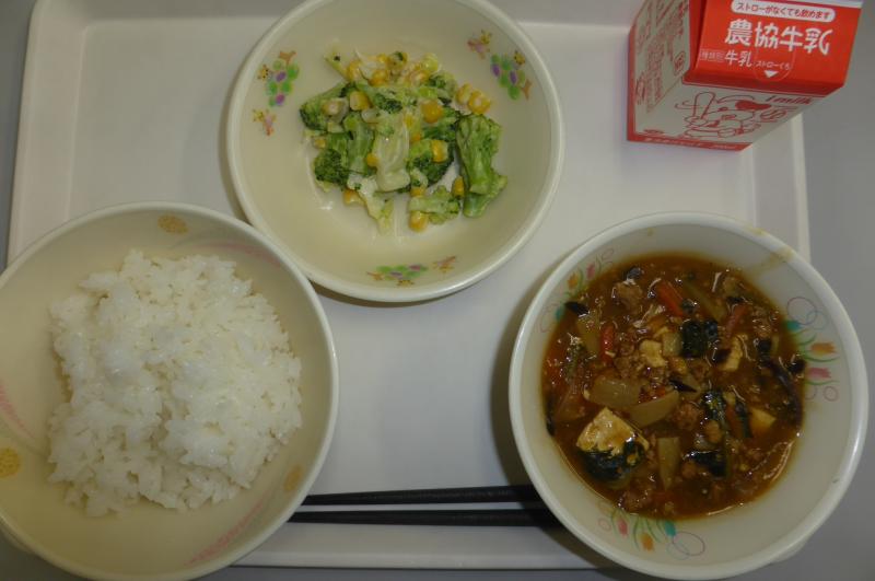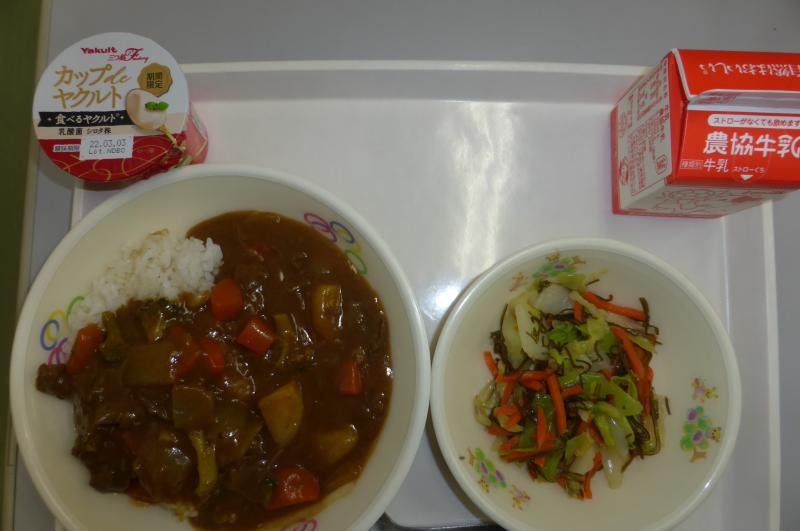 ヨーグルトはヤクルト味です。個人的には飲むヤクルトよりおいしいと思い、給食に取り入れてみました。中学年のクラスで苦手な児童もいました。来月は河井小学校のリクエスト給食にも登場しますので、カレー好きな児童は楽しみにしてくださいね。