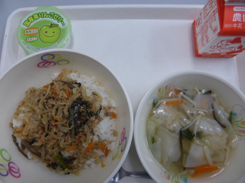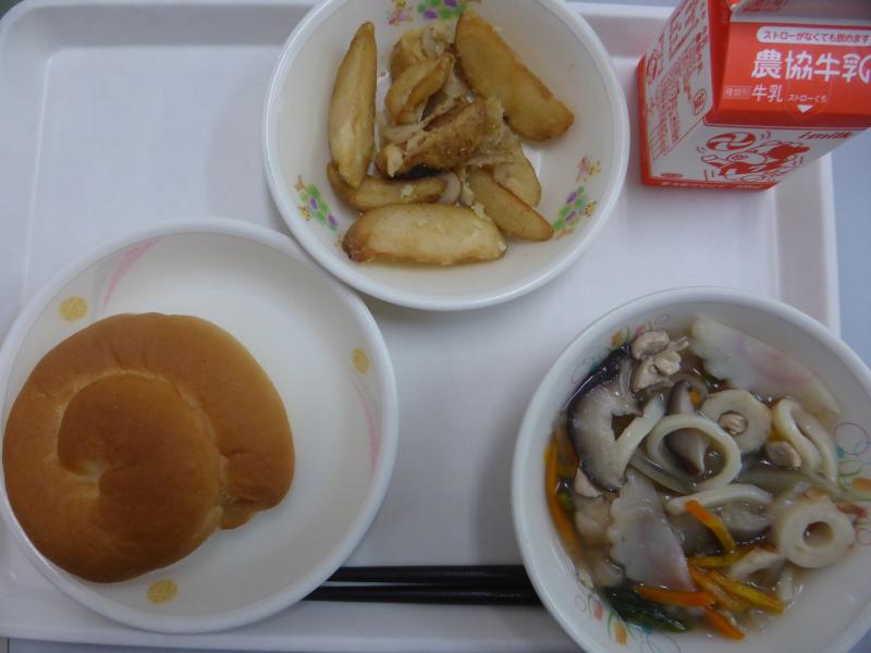 ・鶏さつま(大量のさつまいもに2種類のひき肉、玉ねぎ、枝豆をあわせて、ご飯向けに甘じょっぱい味に調理員さんが炒め煮して頂きました。今日は汁物と食物繊維が豊富な給食です。)