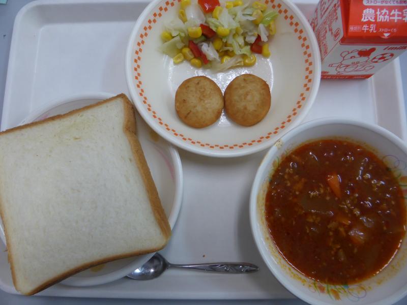 ・チリコンカン (元はメキシコになりますが、アメリカ南部に移民し広まった料理です。おかずとしても献立になりますが、ナゲットにつけてみたり、パンにもあうのでスープにした給食用のアレンジです。カットトマト、デミグラスソース、辛みにチリパウダーが入ります。具はひき肉、発芽大豆、大豆、ひよこ豆、人参、玉ねぎです。たんぱく質もしっかりとれます。)