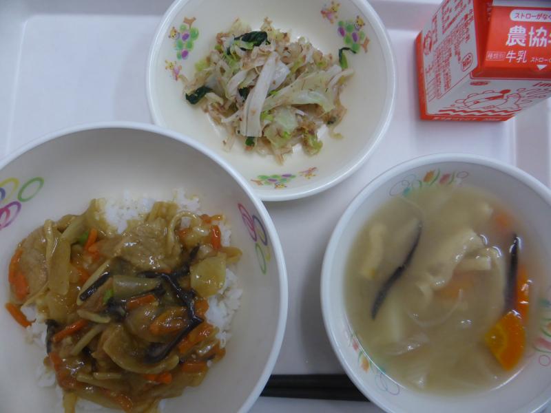 ・豚肉のカレー丼(和風のカレー丼です、調味料はだしと醤油を使いました。食感に筍・きくらげが入っています、とろみを片栗粉を入れて調理員さんが食べやすく工夫して頂きました。)