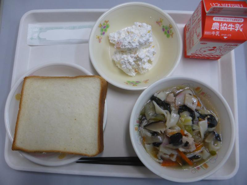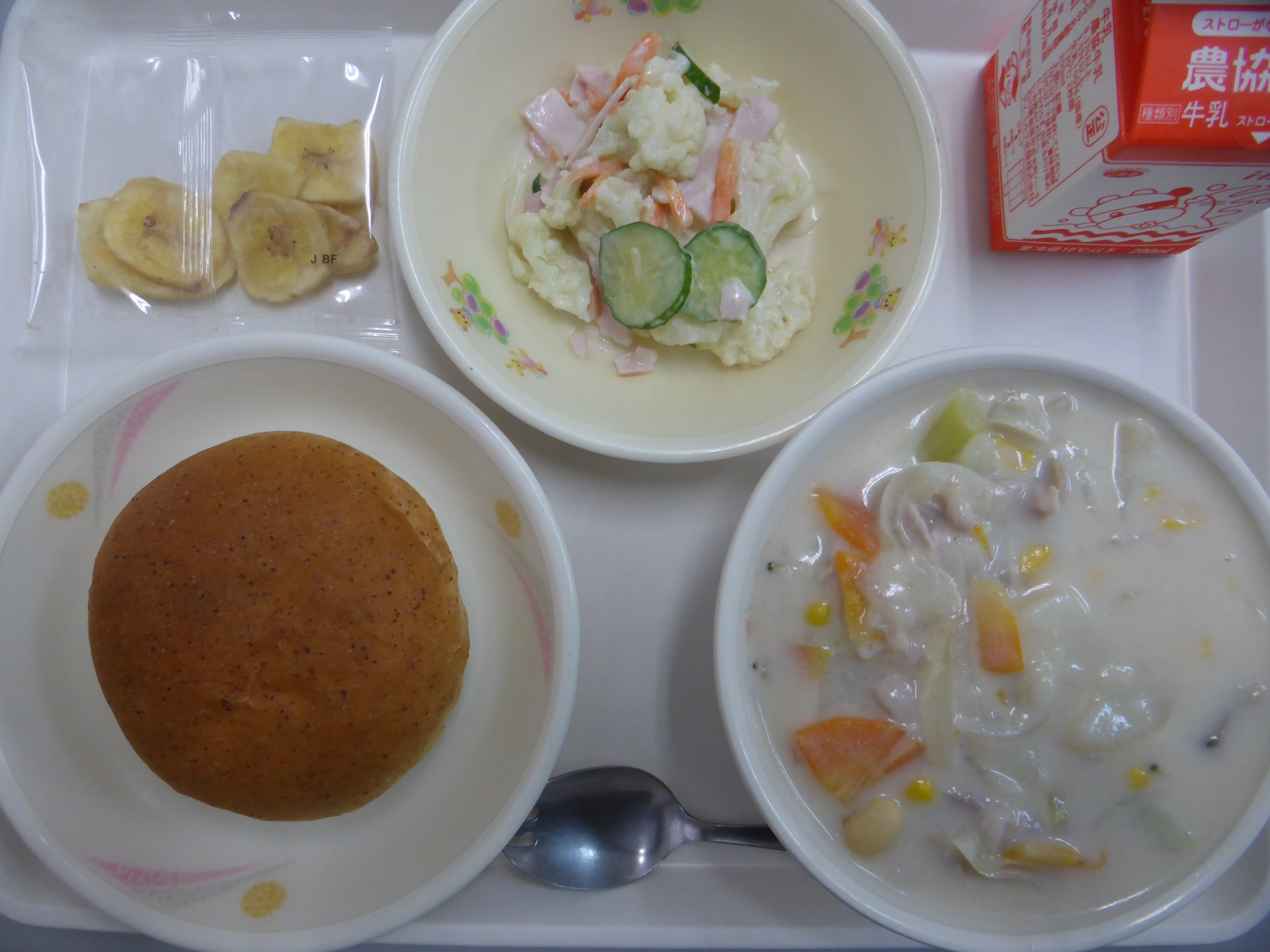*中学年の量です。本日のクリームシチューは精肉屋さんから抗原性鶏インフルエンザの影響もあり、鶏肉の
