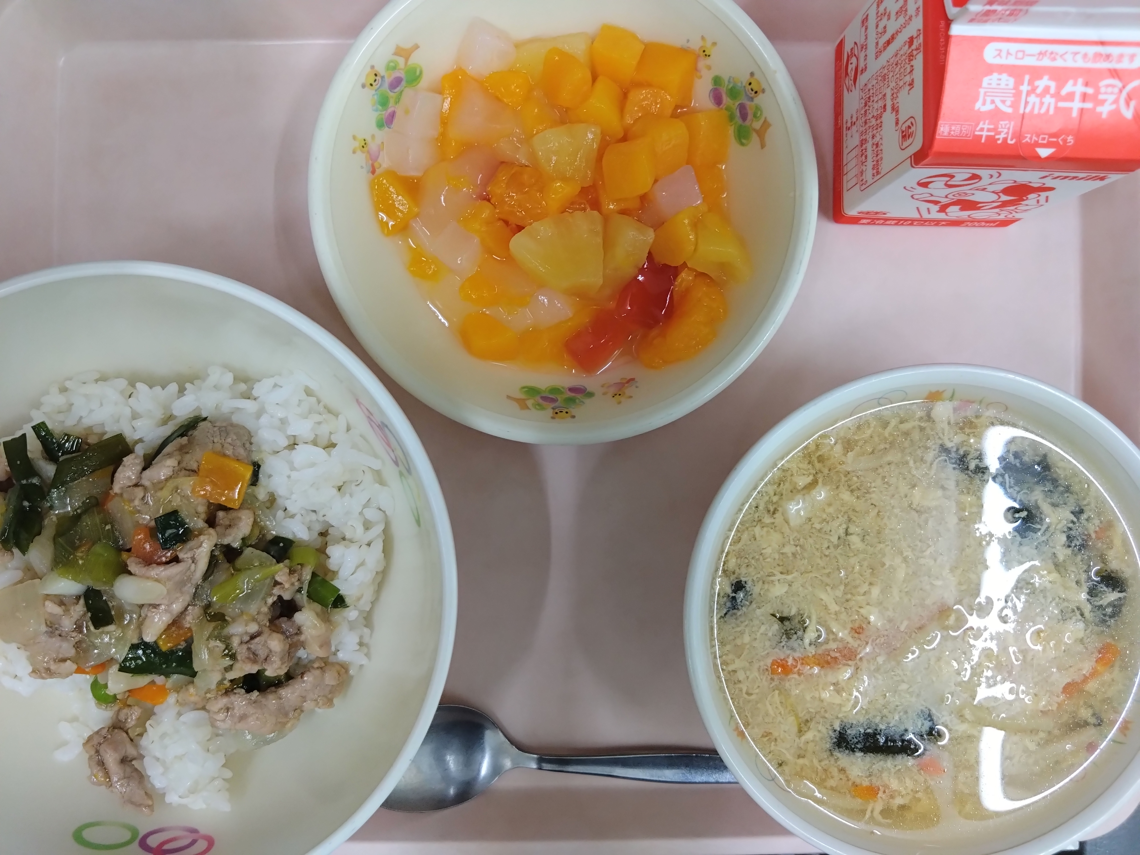 *中学年の量です。フルーツポンチは運動会にちなんで、ナタデココもあるので分かりにくいですが、ゼリーは赤・白にしてみました。運動会に供えて丼にしてみました。サンラータンは少し酸味のある卵スープです。_