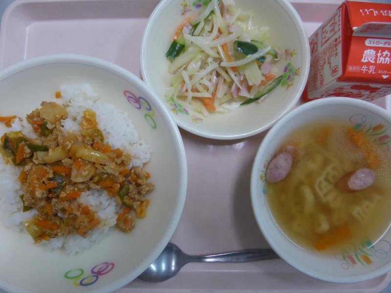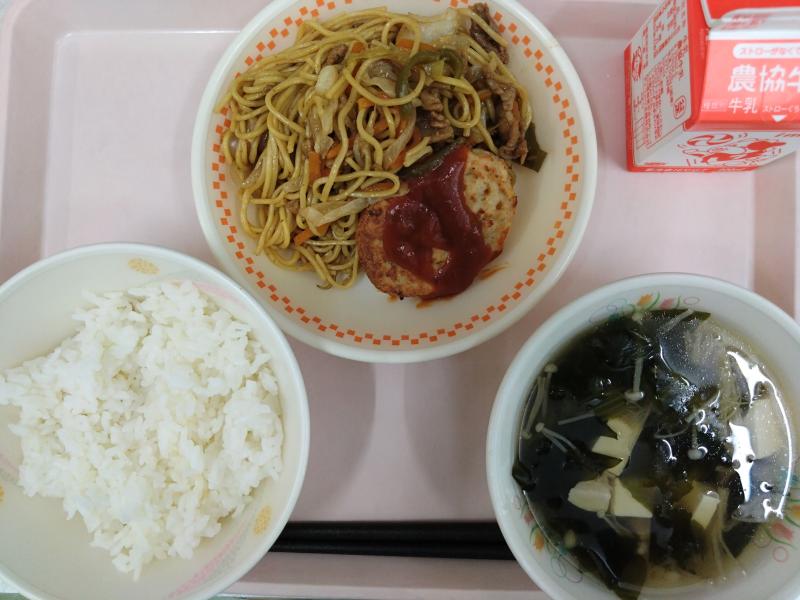 *本日は大人量です。焼きそばはパン給食より半分にしましたが、ご飯と組み合わせると全体的量があるので