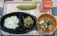 ごはん、ちゃんこ鍋、切干のピリ辛炒め、メロン(支援物資)、牛乳
