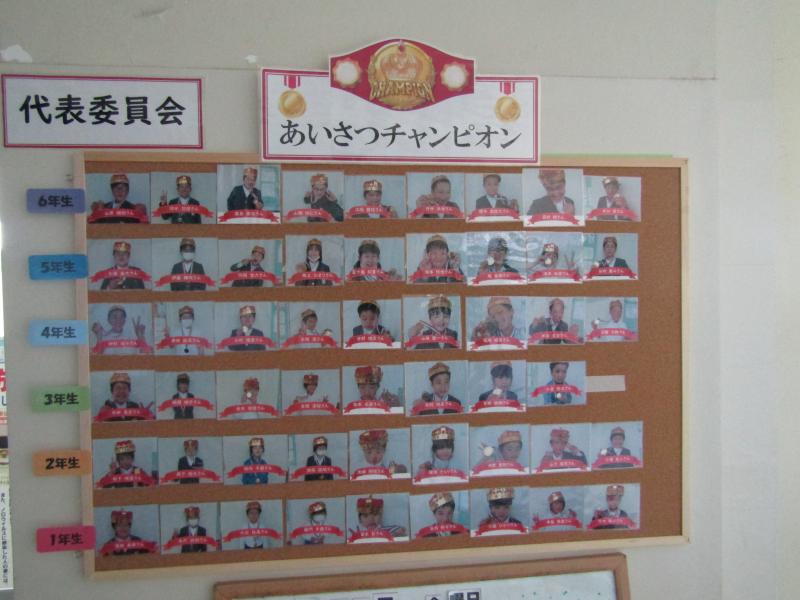 挨拶チャンピオンの取り組みは、代表委員会が企画してくれた取り組みです。各学年で元気な挨拶をした人をチャンピオンとする取り組みです。チャンピオンになりたいという思いで、明らかに大きな声で挨拶する児童が増えました。健全な競争意識による効果だと考えています。