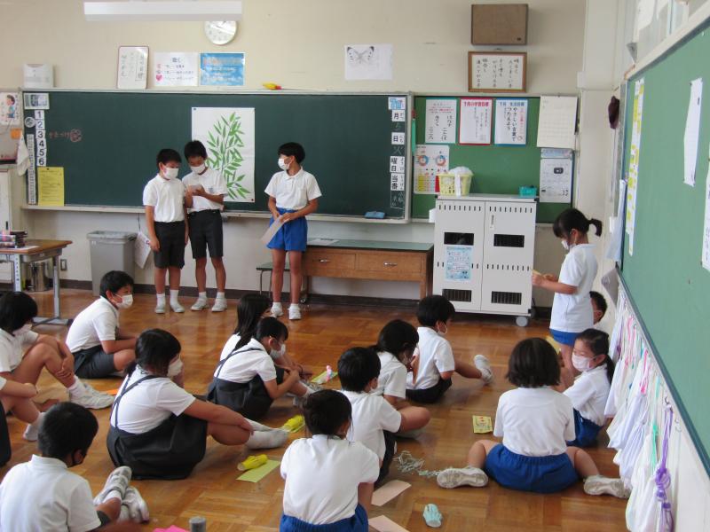 5日の縦割りなかよし会でつくった七夕かざりを1階に掲示しました。