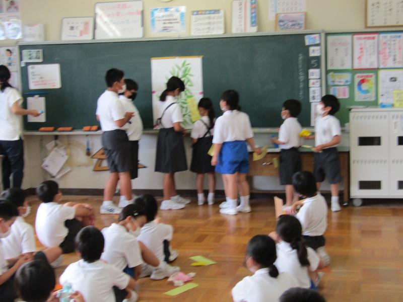 願い事を発表し合わると、短冊を笹の絵に貼り付けまました。