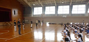 3限目に、三夜踊り保存会の方に来ていただいて、練習会を行いました。