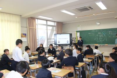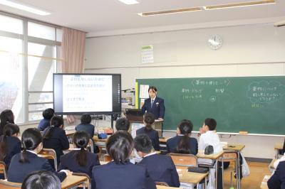 最初に、能美警察署の方から、パワーポイントを使って、「薬物とはどういものなのか?」「どのような症状になるのか?」「薬物乱用をしないためにはどうすればよいか?」の説明がありました。その後、クイズを使って、薬物乱用をしないために知っておいてほしいことを確認しました。最後に、薬物は自分や周りの人にたくさんの悪影響を与えるので「薬物乱用は絶対にしないでください」とのメッセージもいただきました。