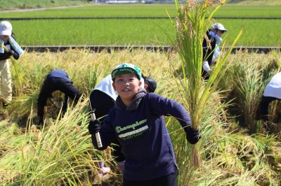 5年生は、米づくり体験農園で育てた稲の刈り取りを行いました。