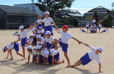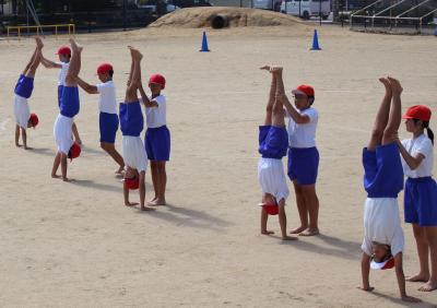 次に、組体操の練習をしました。しばらくフラッグの練習を続けていたので、組体操の動き出すタイミングを忘れてしまっている子もいましたが、こちらも練習するうちにそろってきました。