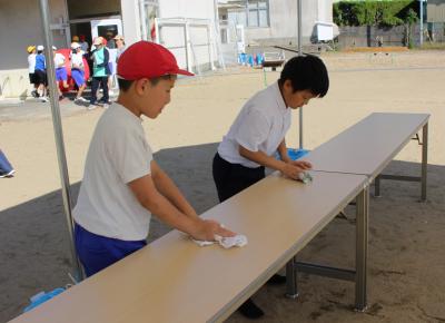 今日は、久しぶりに晴れたので、運動場で運動会の開閉会式の練習をしました。