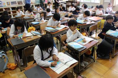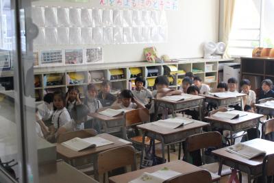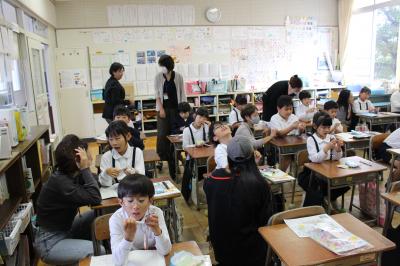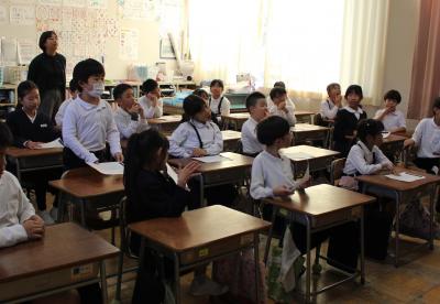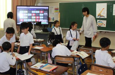 6年生に2年生の頃を思い出してもらおうと、1限目 体育「なわとび」、2限目 音楽「アイアイ」、3限目 国語「スイミー」、4限目 算数「九九」を披露。4限目の「九九」では、だじゃれをきかせ笑いを誘っていました。
