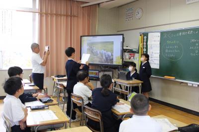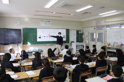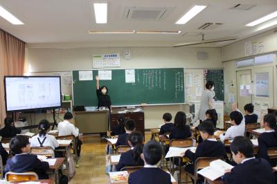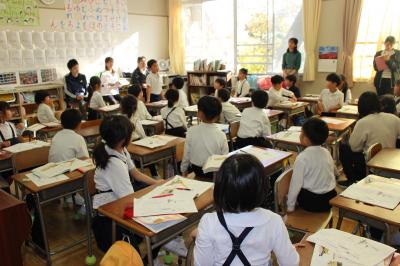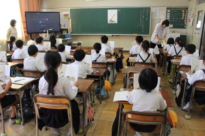 次に、4年生です。4年生は国語科で「調べて話そう、生活調査隊」の単元を学習しています。今日は、各班が調べたことを別の部屋で発表し、それをオンラインで観て修正点などはないか考えていました。他の班の発表を見て、気づくこともいくつかあって、それを自分たちの発表に生かそうとする姿も見られました。