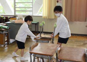 手の空いている人から、机と椅子をを組み立てて、水拭きします。