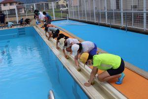 体育館では、モップのゴミの払い方を教えてもらっています。
