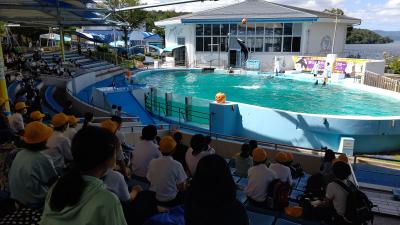 のとじま水族館でイルカショーをみています。天気もよく、みんな楽しんでいます。