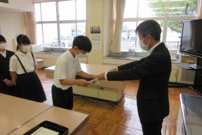 硬筆書写コンクール表彰式を行いました。川北小からは、参与賞1名、特選6名、入選7名が表彰されました。参与賞は県庁に展示してあります。おめでとうございます。