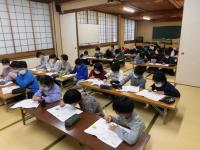 今年も山本先生に、書初めの指導をお願いしました。今日は3年生と6年生でした。集まって、じっくり話を聞いています。
