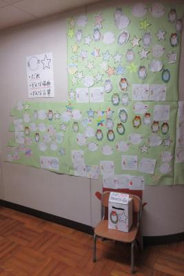 人権週間に合わせて、「心のクリスマスツリーポスト」をおいています。友達にしてもらってうれしかったこと、言われてうれしかったことなどをたくさん貼っています。